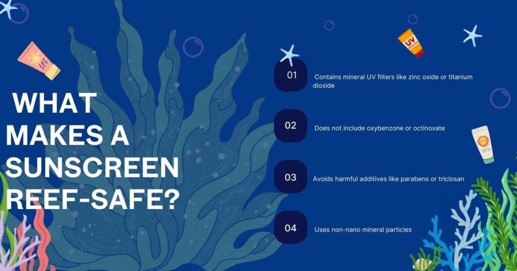 Sunscreens labeled as reef-safe typically avoid ingredients that research has linked to coral reef damage and marine toxicity.